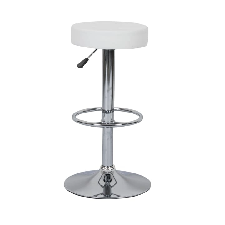 This minimalist modern bar chair features a clean, contemporary design ideal for sleek home interiors, bars, or commercial spaces. The seat is round and comfortably cushioned with white faux leather upholstery, offering a fresh and sophisticated appearance.