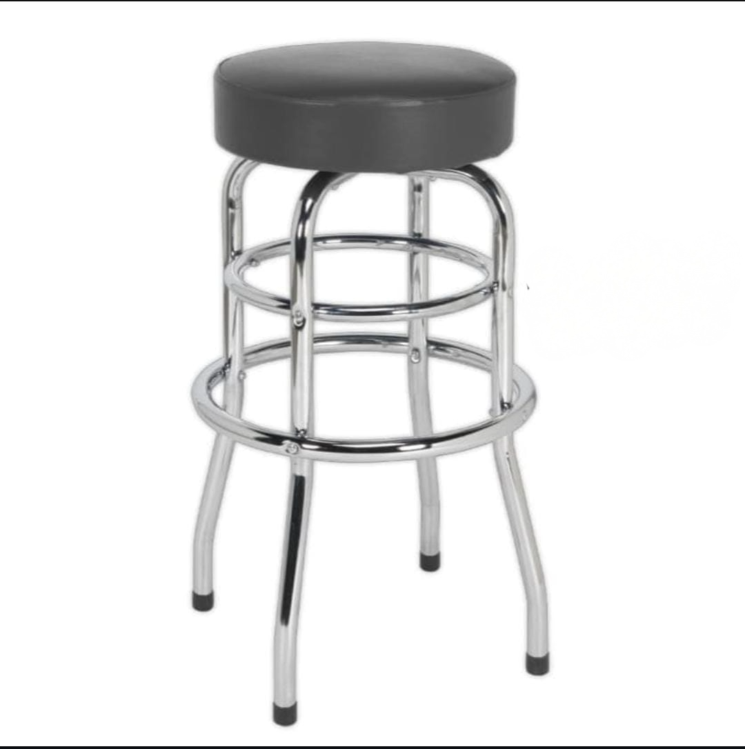 This bar chair combines modern industrial style with durable functionality, making it an ideal seating option for both commercial and residential settings. The chair features a round, cushioned seat upholstered in sleek black faux leather for comfort and easy maintenance. The seat is mounted atop a robust chrome-plated metal frame that provides long-lasting strength and a stylish, reflective finish.