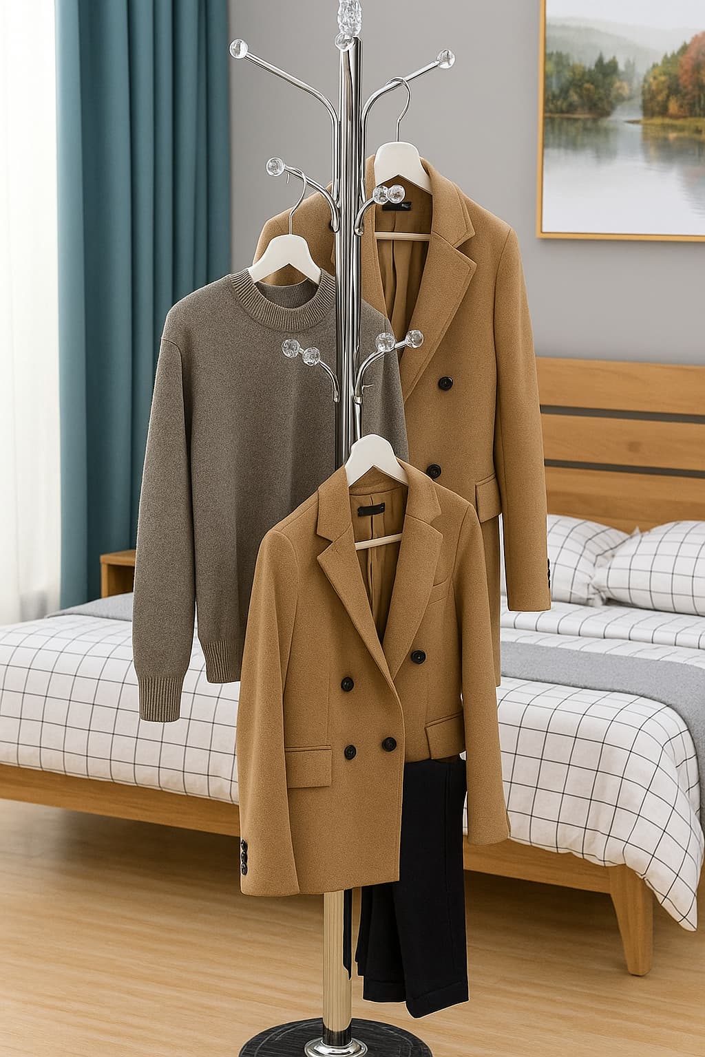 A sleek and elegant metal coat rack stand with a polished chrome finish, designed for contemporary interiors. Positioned in a stylish bedroom, the rack includes multiple curved arms branching out in a symmetrical arrangement from a central pole. Each arm is topped with a crystal-like acrylic knob, adding a touch of sophistication and preventing garments from slipping off.