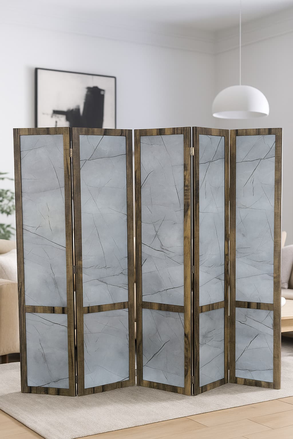 This is a stylish folding room divider featuring a modern marble-textured panel design in a cool-toned greyish blue. The divider consists of five foldable panels, each framed in the same marble-like finish for a seamless, contemporary appearance. Subtle vein patterns across the surface mimic the look of natural stone, adding an elegant and upscale touch.