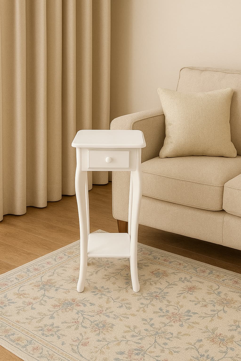 This table includes a convenient pull-out drawer with a round knob for discreet storage of small items like remotes or notepads. Beneath the drawer, a lower shelf provides extra space for organizing or displaying home accessories.