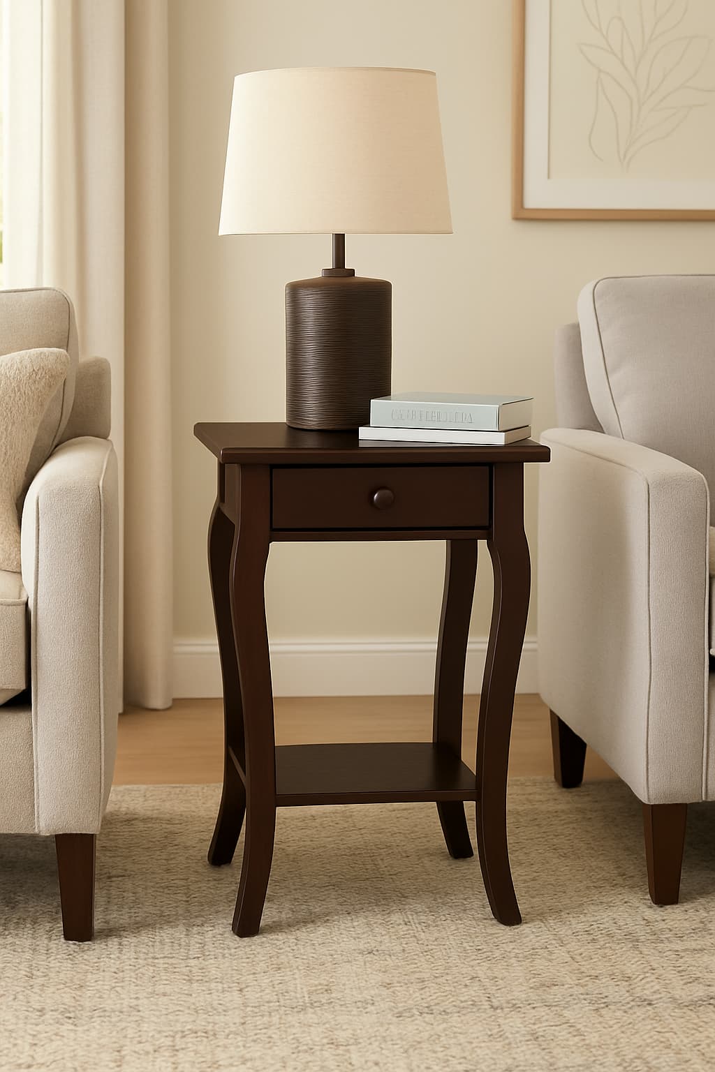 Classic dark brown accent table with a drawer and lower shelf, featuring curved legs and a timeless design. Ideal for living rooms and bedside use.