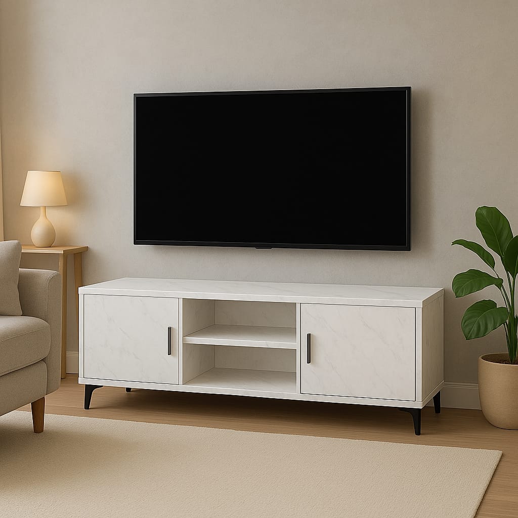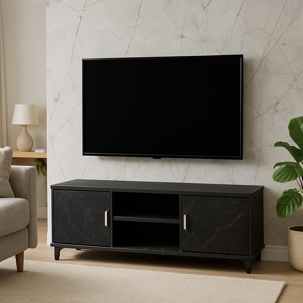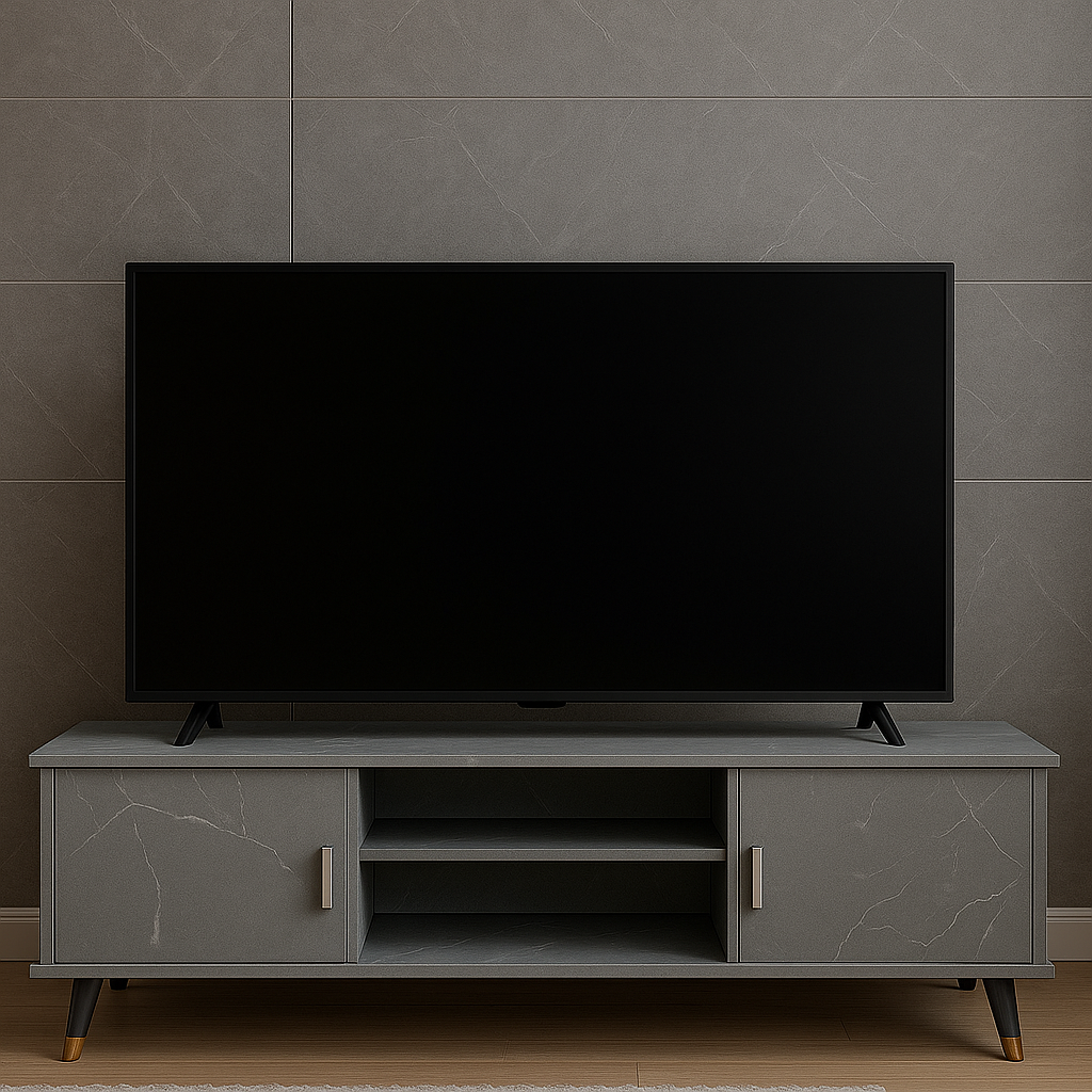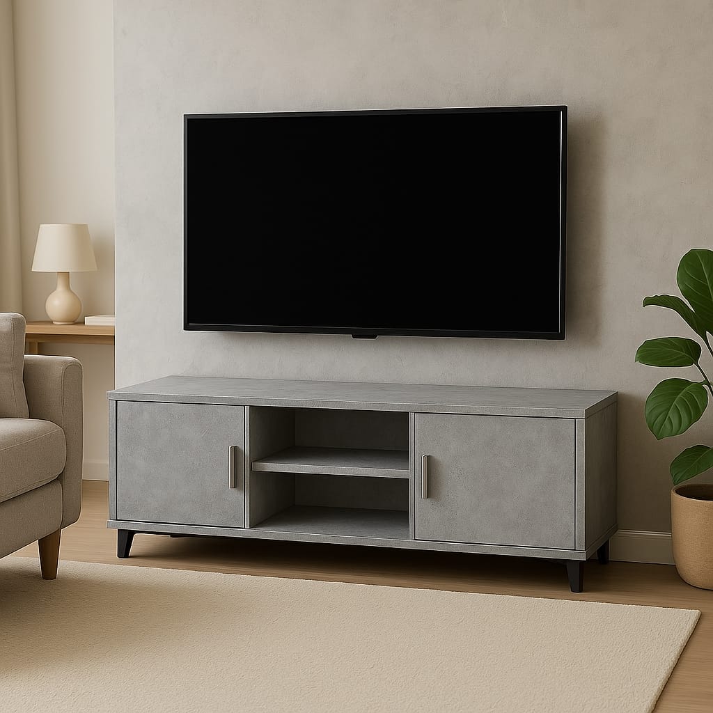 This TV cabinet is a sleek and contemporary piece crafted in a modern finish that adds a refined industrial touch to any living room. Built with functionality and clean design in mind, the cabinet features a low-profile rectangular structure with two spacious closed compartments on either side, ideal for storing electronics, accessories, or media items. In the center, two open shelves provide ample space for set-top boxes, gaming consoles, or decorative accents.