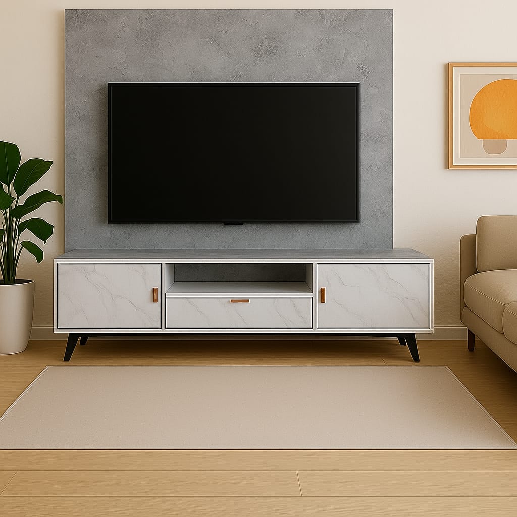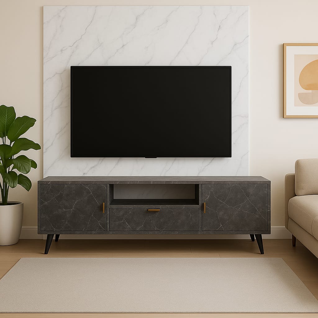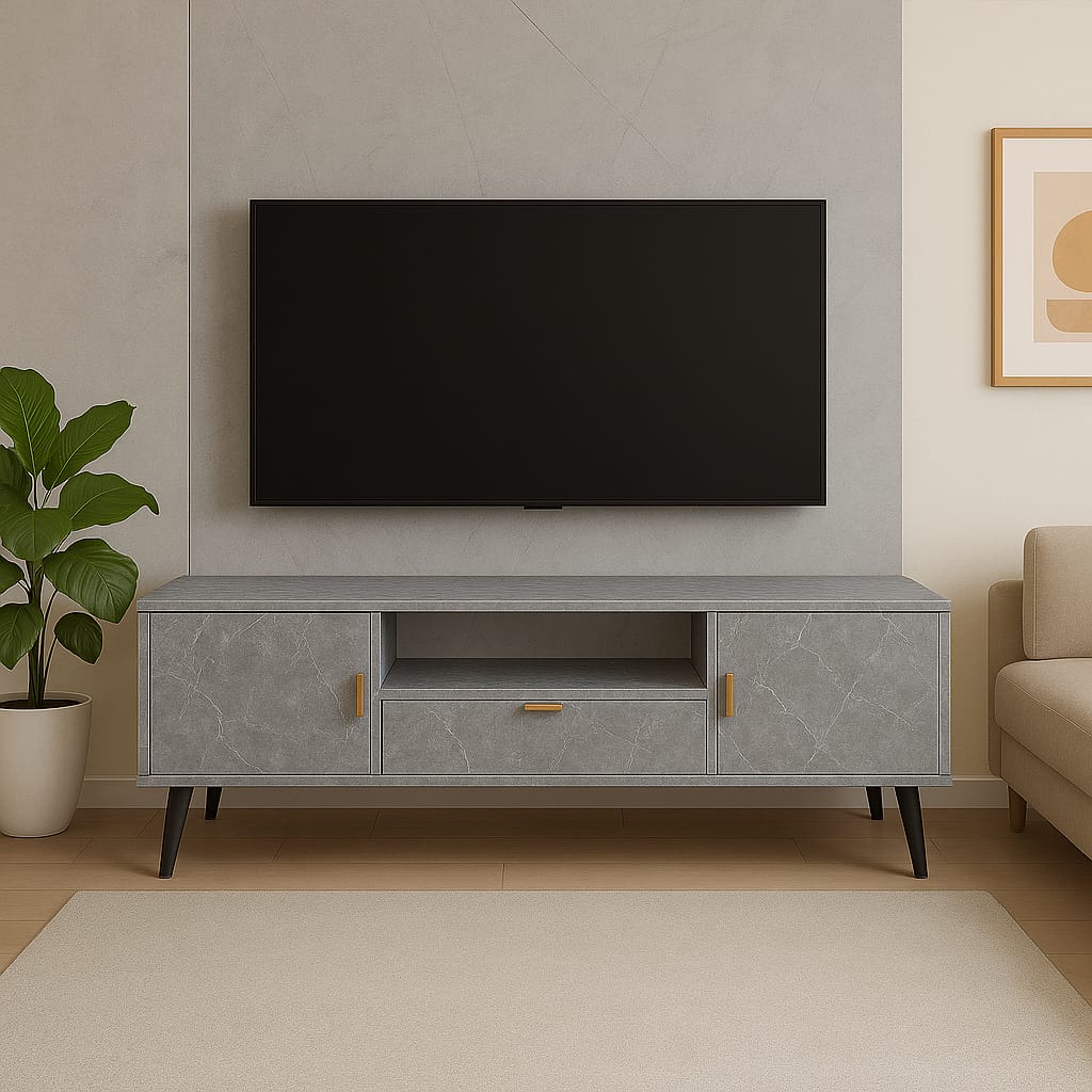 Upgrade your living space with this stylish and functional TV table. Designed with a sleek marble finish and matte grey top, it combines elegance with practicality. Featuring two side cabinets, one central drawer, and an open shelf for media devices, it offers ample storage for your entertainment needs. Accented with minimalist copper-tone handles and supported by sturdy angled legs.